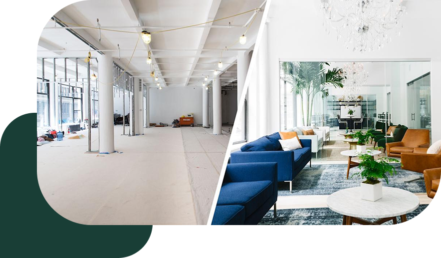 Efficient space Our strategic commercial renovation maximizes your available space while improving organization in your office. We also make collaborative zones for meetings, teamwork, and business interactions.